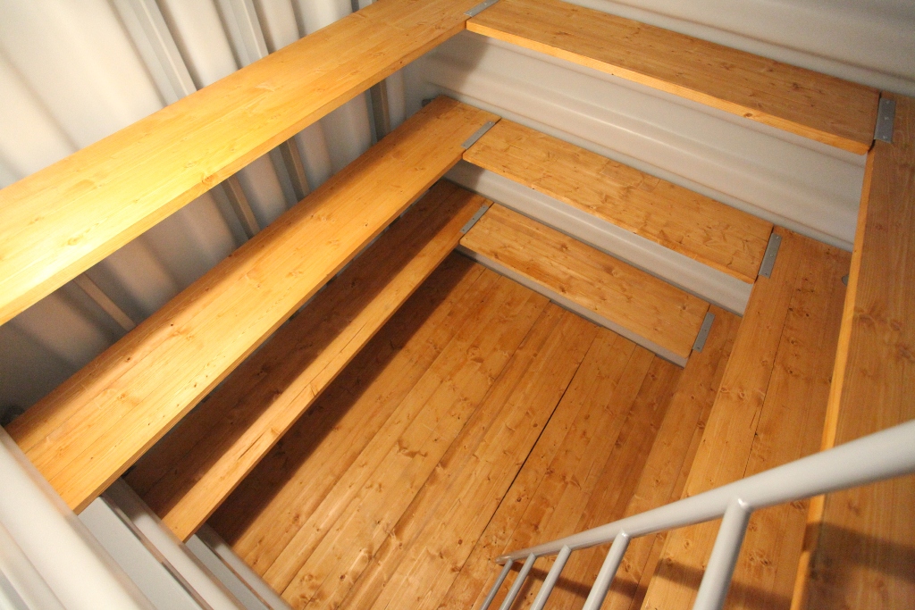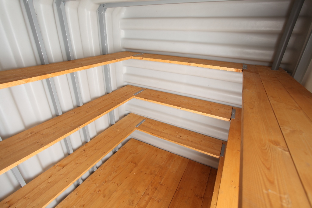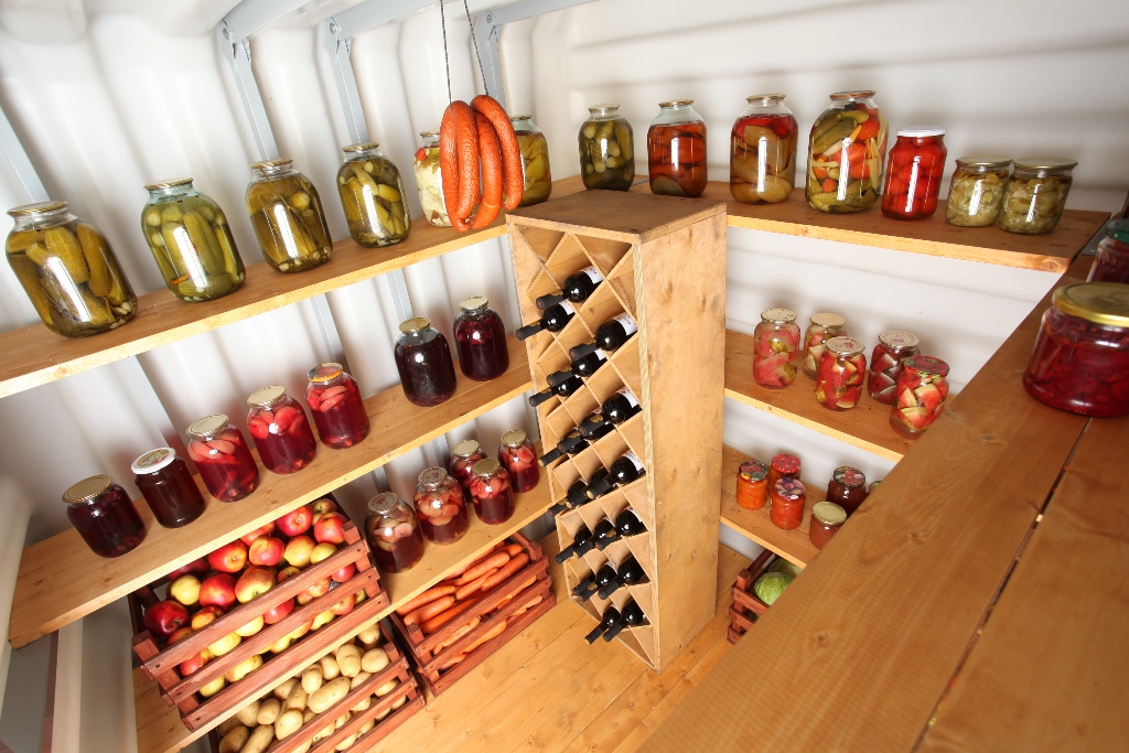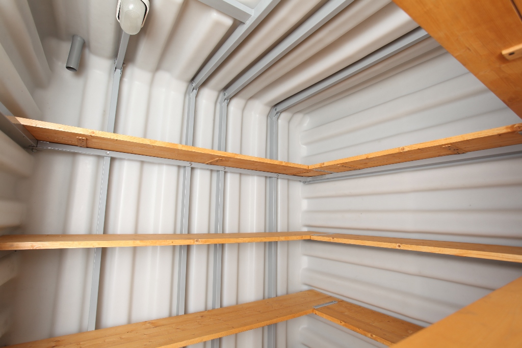 2. Погреб "Тингард" оборудован деревянными полками, полом, приточной и вытяжной вентиляцией, освещением, лестницей и крышкой-люком. Вам не нужно беспокоиться о дополнительном оборудовании.